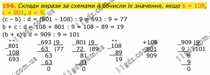 Склади вирази за схемами й обчисли їх значення, якщо b = 108, c = 801, d = 9. (c – b) : d = (801 – 108) : 9 = 693 : 9 = 77 b + c : d = 108 + 801 : 9 = 108 – 89 = 19 (b + c) : d = 909 : 9 = 101