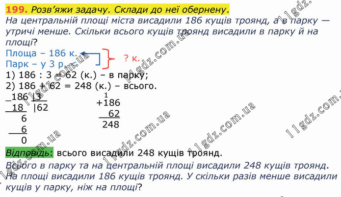 Розв’яжи задачу. Склади до неї обернену. На центральній площі міста висадили 186 кущів троянд, а в парку — утричі менше. Скільки всього кущів троянд висадили в парку й на площі?