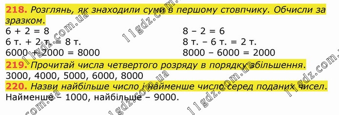 Розглянь, як знаходили суми в першому стовпчику. Обчисли за зразком. 6 + 2 = 8 6 т. + 2 т. = 8 т. 6000 + 2000 = 8000 8 – 2 = 6 8 т. – 6 т. = 2 т. 8000 – 6000 = 2000 219. Прочитай числа четвертого розряду в порядку збільшення. 3000, 4000, 5000, 6000, 8000 220. Назви найбільше число і найменше число серед поданих чисел. Найменше – 1000, найбільше – 9000.
