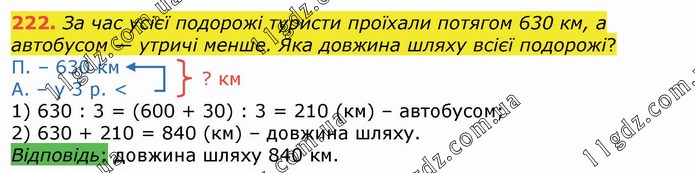За час усієї подорожі туристи проїхали потягом 630 км, а автобусом — утричі менше. Яка довжина шляху всієї подорожі? П. – 630 км А. – у 3 р. < 1) 630 : 3 = (600 + 30) : 3 = 210 (км) – автобусом; 2) 630 + 210 = 840 (км) – довжина шляху. Відповідь: довжина шляху 840 км.