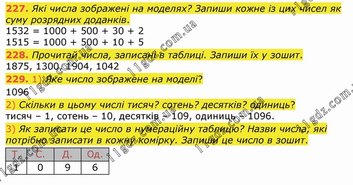 Які числа зображені на моделях? Запиши кожне із цих чисел як суму розрядних доданків. 1532 = 1000 + 500 + 30 + 2 1515 = 1000 + 500 + 10 + 5 228. Прочитай числа, записані в таблиці. Запиши їх у зошит. 1875, 1300, 1904, 1042 229. 1) Яке число зображене на моделі? 1096 2) Скільки в цьому числі тисяч? сотень? десятків? одиниць? тисяч – 1, сотень – 10, десятків – 109, одиниць – 1096. 3) Як записати це число в нумераційну таблицю? Назви числа, які потрібно записати в кожну комірку. Запиши це число в зошит.
