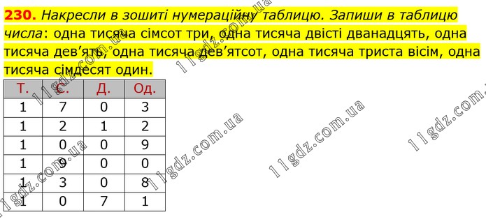 Накресли в зошиті нумераційну таблицю. Запиши в таблицю числа: одна тисяча сімсот три, одна тисяча двісті дванадцять, одна тисяча дев’ять, одна тисяча дев’ятсот, одна тисяча триста вісім, одна тисяча сімдесят один.