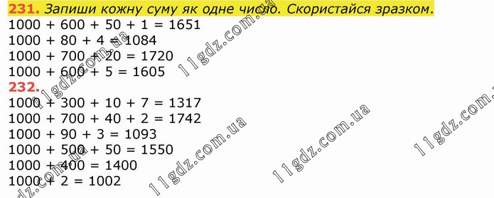 Запиши кожну суму як одне число. Скористайся зразком. 1000 + 600 + 50 + 1 = 1651 1000 + 80 + 4 = 1084 1000 + 700 + 20 = 1720 1000 + 600 + 5 = 1605 232. 1000 + 300 + 10 + 7 = 1317 1000 + 700 + 40 + 2 = 1742 1000 + 90 + 3 = 1093 1000 + 500 + 50 = 1550 1000 + 400 = 1400 1000 + 2 = 1002