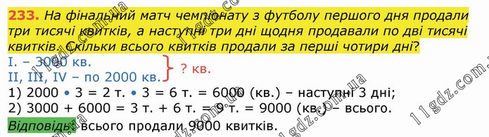 На фінальний матч чемпіонату з футболу першого дня продали три тисячі квитків, а наступні три дні щодня продавали по дві тисячі квитків. Скільки всього квитків продали за перші чотири дні? І. – 3000 кв. ІІ, ІІІ, ІV – по 2000 кв. 1) 2000 • 3 = 2 т. • 3 = 6 т. = 6000 (кв.) – наступні 3 дні; 2) 3000 + 6000 = 3 т. + 6 т. = 9 т. = 9000 (кв.) – всього. Відповідь: всього продали 9000 квитків.