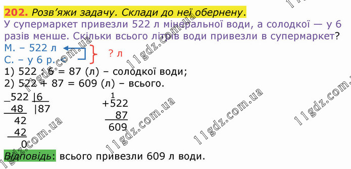 Розв’яжи задачу. Склади до неї обернену. У супермаркет привезли 522 л мінеральної води, а солодкої — у 6 разів менше. Скільки всього літрів води привезли в супермаркет? М. – 522 л С. – у 6 р. < 1) 522 : 6 = 87 (л) – солодкої води; 2) 522 + 87 = 609 (л) – всього.