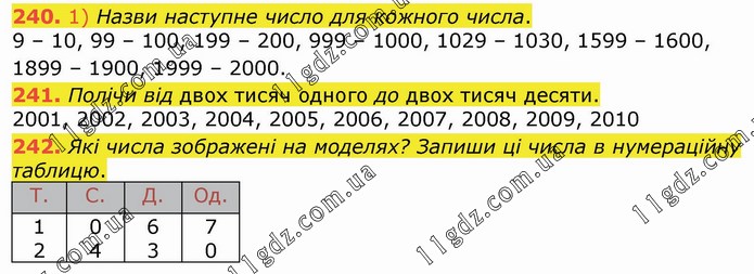 1) Назви наступне число для кожного числа. 9 – 10, 99 – 100, 199 – 200, 999 – 1000, 1029 – 1030, 1599 – 1600, 1899 – 1900, 1999 – 2000. 241. Полічи від двох тисяч одного до двох тисяч десяти. 2001, 2002, 2003, 2004, 2005, 2006, 2007, 2008, 2009, 2010 242. Які числа зображені на моделях? Запиши ці числа в нумераційну таблицю.