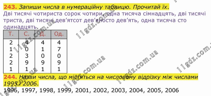 Запиши числа в нумераційну таблицю. Прочитай їх. Дві тисячі чотириста сорок чотири, одна тисяча сімнадцять, дві тисячі триста, дві тисячі дев’ятсот дев’яносто дев’ять, одна тисяча сто одинадцять. Назви числа, що містяться на числовому відрізку між числами 1995 і 2006. 1996, 1997, 1998, 1999, 2001, 2002, 2003, 2004, 2005, 2006
