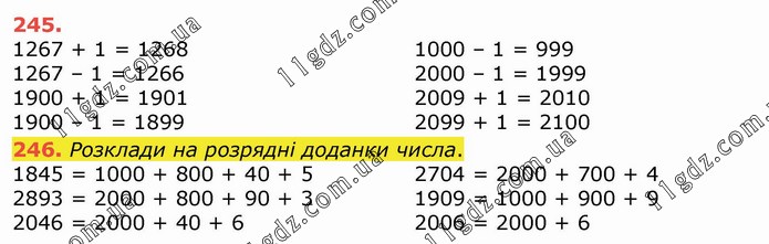 1267 + 1 = 1268 1267 – 1 = 1266 1900 + 1 = 1901 1900 – 1 = 1899 1000 – 1 = 999 2000 – 1 = 1999 2009 + 1 = 2010 2099 + 1 = 2100 246. Розклади на розрядні доданки числа. 1845 = 1000 + 800 + 40 + 5 2893 = 2000 + 800 + 90 + 3 2046 = 2000 + 40 + 6 2704 = 2000 + 700 + 4 1909 = 1000 + 900 + 9 2006 = 2000 + 6