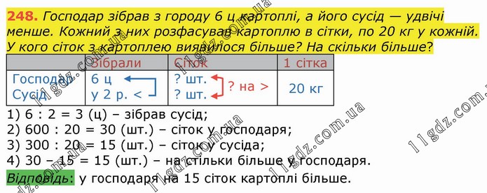 Господар зібрав з городу 6 ц картоплі, а його сусід — удвічі менше. Кожний з них розфасував картоплю в сітки, по 20 кг у кожній. У кого сіток з картоплею виявилося більше? На скільки більше? 1) 6 : 2 = 3 (ц) – зібрав сусід; 2) 600 : 20 = 30 (шт.) – сіток у господаря; 3) 300 : 20 = 15 (шт.) – сіток у сусіда; 4) 30 – 15 = 15 (шт.) – на стільки більше у господаря. Відповідь: у господаря на 15 сіток картоплі більше.