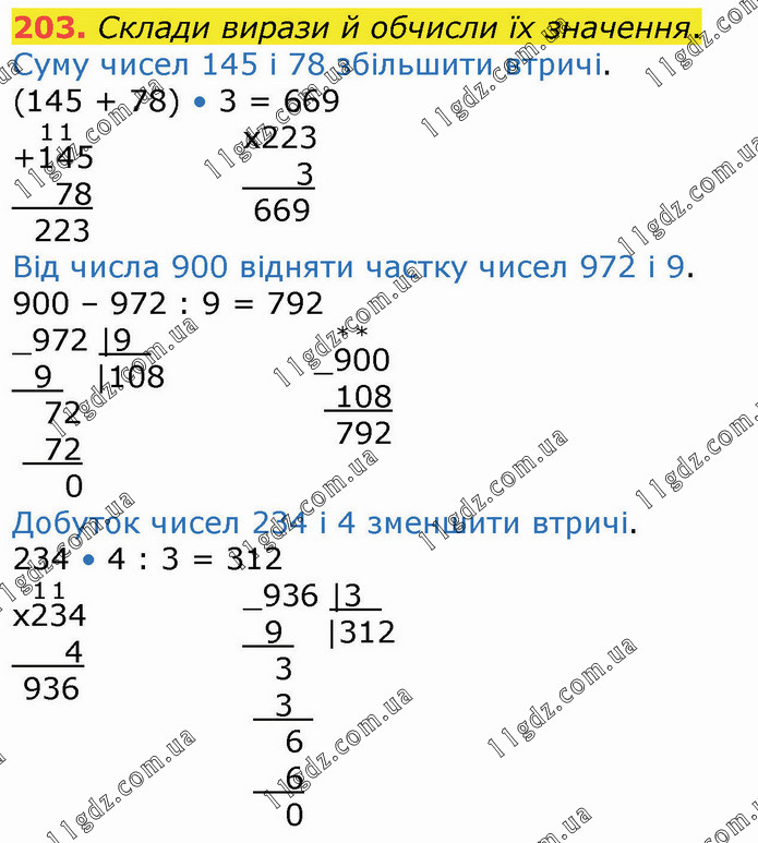 Склади вирази й обчисли їх значення. Суму чисел 145 і 78 збільшити втричі. Від числа 900 відняти частку чисел 972 і 9. Добуток чисел 234 і 4 зменшити втричі.