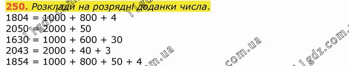 Розклади на розрядні доданки числа. 1804 = 1000 + 800 + 4 2050 = 2000 + 50 1630 = 1000 + 600 + 30 2043 = 2000 + 40 + 3 1854 = 1000 + 800 + 50 + 4