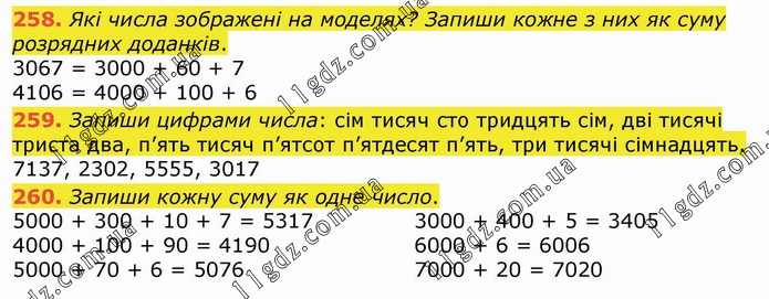 Які числа зображені на моделях? Запиши кожне з них як суму розрядних доданків. 3067 = 3000 + 60 + 7 4106 = 4000 + 100 + 6 259. Запиши цифрами числа: сім тисяч сто тридцять сім, дві тисячі триста два, п’ять тисяч п’ятсот п’ятдесят п’ять, три тисячі сімнадцять. 7137, 2302, 5555, 3017 260. Запиши кожну суму як одне число. 5000 + 300 + 10 + 7 = 5317 4000 + 100 + 90 = 4190 5000 + 70 + 6 = 5076 3000 + 400 + 5 = 3405 6000 + 6 = 6006 7000 + 20 = 7020