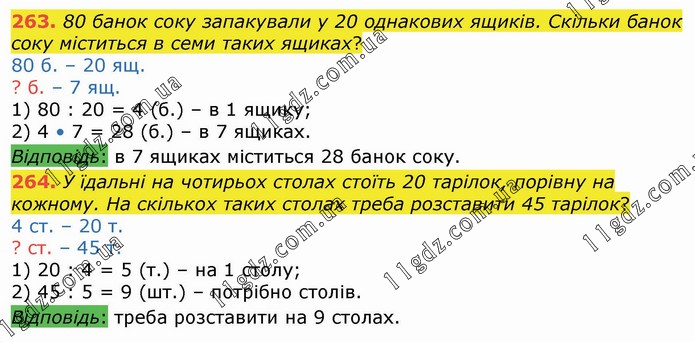 80 банок соку запакували у 20 однакових ящиків. Скільки банок соку міститься в семи таких ящиках? 80 б. – 20 ящ. ? б. – 7 ящ. 1) 80 : 20 = 4 (б.) – в 1 ящику; 2) 4 • 7 = 28 (б.) – в 7 ящиках. Відповідь: в 7 ящиках міститься 28 банок соку. 264. У їдальні на чотирьох столах стоїть 20 тарілок, порівну на кожному. На скількох таких столах треба розставити 45 тарілок? 4 ст. – 20 т. ? ст. – 45 т. 1) 20 : 4 = 5 (т.) – на 1 столу; 2) 45 : 5 = 9 (шт.) – потрібно столів. Відповідь: треба розставити на 9 столах.