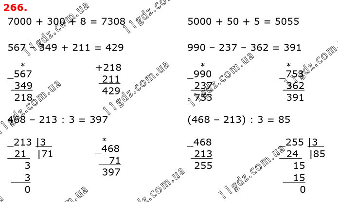 7000 + 300 + 8 = 7308 5000 + 50 + 5 = 5055 567 – 349 + 211 = 429 990 – 237 – 362 = 391 468 – 213 : 3 = 397 (468 – 213) : 3 = 85