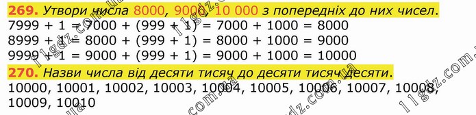 Утвори числа 8000, 9000, 10 000 з попередніх до них чисел. 7999 + 1 = 7000 + (999 + 1) = 7000 + 1000 = 8000 8999 + 1 = 8000 + (999 + 1) = 8000 + 1000 = 9000 9999 + 1 = 9000 + (999 + 1) = 9000 + 1000 = 10000 270. Назви числа від десяти тисяч до десяти тисяч десяти. 10000, 10001, 10002, 10003, 10004, 10005, 10006, 10007, 10008, 10009, 10010