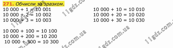 Обчисли за зразком. 10 000 + 1 = 10 001 10 000 + 2 = 10 002 10 000 + 3 = 10 003 10 000 + 10 = 10 010 10 000 + 20 = 10 020 10 000 + 30 = 10 030 10 000 + 100 = 10 100 10 000 + 200 = 10 200 10 000 + 300 = 10 300