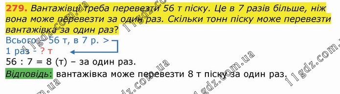 Вантажівці треба перевезти 56 т піску. Це в 7 разів більше, ніж вона може перевезти за один раз. Скільки тонн піску може перевезти вантажівка за один раз? Всього – 56 т, в 7 р. > 1 раз - ? т 56 : 7 = 8 (т) – за один раз. Відповідь: вантажівка може перевезти 8 т піску за один раз.