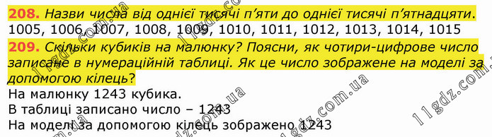 Назви числа від однієї тисячі п’яти до однієї тисячі п’ятнадцяти. 1005, 1006, 1007, 1008, 1009, 1010, 1011, 1012, 1013, 1014, 1015 209. Скільки кубиків на малюнку? Поясни, як чотири-цифрове число записане в нумераційній таблиці. Як це число зображене на моделі за допомогою кілець?