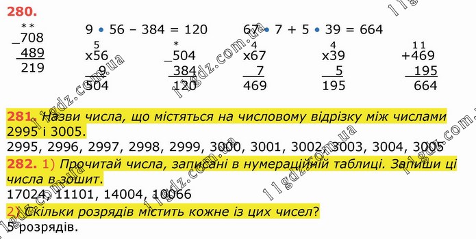 Назви числа, що містяться на числовому відрізку між числами 2995 і 3005. 2995, 2996, 2997, 2998, 2999, 3000, 3001, 3002, 3003, 3004, 3005 282. 1) Прочитай числа, записані в нумераційній таблиці. Запиши ці числа в зошит. 17024, 11101, 14004, 10066 2) Скільки розрядів містить кожне із цих чисел? 5 розрядів.