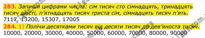 Запиши цифрами числа: сім тисяч сто сімнадцять, тринадцять тисяч двісті, п’ятнадцять тисяч триста сім, сімнадцять тисяч п’ять. 7117, 13200, 15307, 17005 284. 1) Полічи десятками тисяч від десяти тисяч до дев’яноста тисяч. 10000, 20000, 30000, 40000, 50000, 60000, 70000, 80000, 90000
