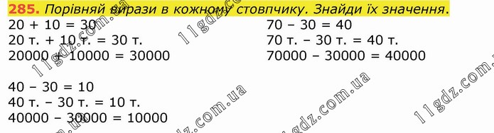 Порівняй вирази в кожному стовпчику. Знайди їх значення. 20 + 10 = 30 20 т. + 10 т. = 30 т. 20000 + 10000 = 30000 70 – 30 = 40 70 т. – 30 т. = 40 т. 70000 – 30000 = 40000 40 – 30 = 10 40 т. – 30 т. = 10 т. 40000 – 30000 = 10000
