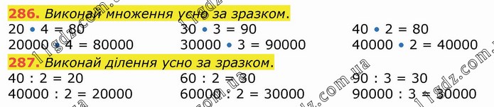 Виконай множення усно за зразком. 20 • 4 = 80 20000 • 4 = 80000 30 • 3 = 90 30000 • 3 = 90000 40 • 2 = 80 40000 • 2 = 40000 287. Виконай ділення усно за зразком. 40 : 2 = 20 40000 : 2 = 20000 60 : 2 = 30 60000 : 2 = 30000 90 : 3 = 30 90000 : 3 = 30000