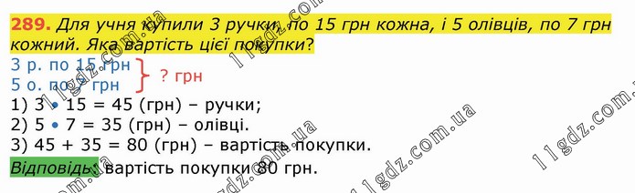 Для учня купили 3 ручки, по 15 грн кожна, і 5 олівців, по 7 грн кожний. Яка вартість цієї покупки? 3 р. по 15 грн 5 о. по 7 грн 1) 3 • 15 = 45 (грн) – ручки; 2) 5 • 7 = 35 (грн) – олівці. 3) 45 + 35 = 80 (грн) – вартість покупки. Відповідь: вартість покупки 80 грн