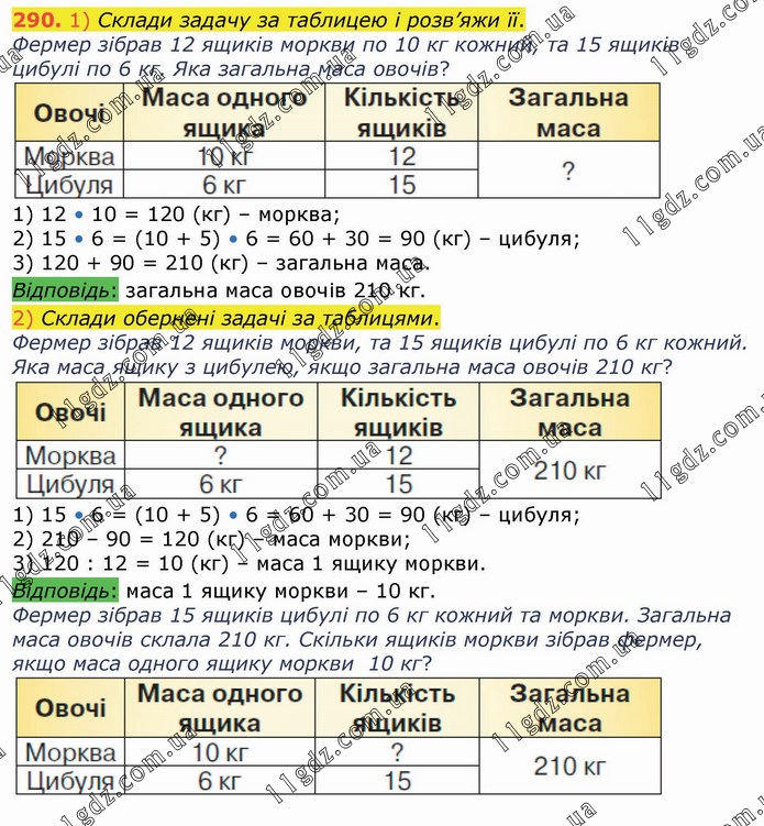 1) Склади задачу за таблицею і розв’яжи її. Фермер зібрав 12 ящиків моркви по 10 кг кожний, та 15 ящиків цибулі по 6 кг. Яка загальна маса овочів? 1) 12 • 10 = 120 (кг) – морква; 2) 15 • 6 = (10 + 5) • 6 = 60 + 30 = 90 (кг) – цибуля; 3) 120 + 90 = 210 (кг) – загальна маса. Відповідь: загальна маса овочів 210 кг. 2) Склади обернені задачі за таблицями. Фермер зібрав 12 ящиків моркви, та 15 ящиків цибулі по 6 кг кожний. Яка маса ящику з цибулею, якщо загальна маса овочів 210 кг? 1) 15 • 6 = (10 + 5) • 6 = 60 + 30 = 90 (кг) – цибуля; 2) 210 – 90 = 120 (кг) – маса моркви; 3) 120 : 12 = 10 (кг) – маса 1 ящику моркви. Відповідь: маса 1 ящику моркви – 10 кг. Фермер зібрав 15 ящиків цибулі по 6 кг кожний та моркви. Загальна маса овочів склала 210 кг. Скільки ящиків моркви зібрав фермер, якщо маса одного ящику моркви 10 кг?
