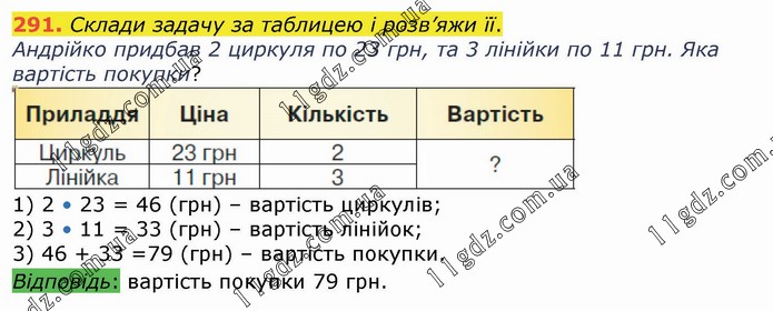 Склади задачу за таблицею і розв’яжи її. Андрійко придбав 2 циркуля по 23 грн, та 3 лінійки по 11 грн. Яка вартість покупки? 1) 2 • 23 = 46 (грн) – вартість циркулів; 2) 3 • 11 = 33 (грн) – вартість лінійок; 3) 46 + 33 =79 (грн) – вартість покупки. Відповідь: вартість покупки 79 грн.