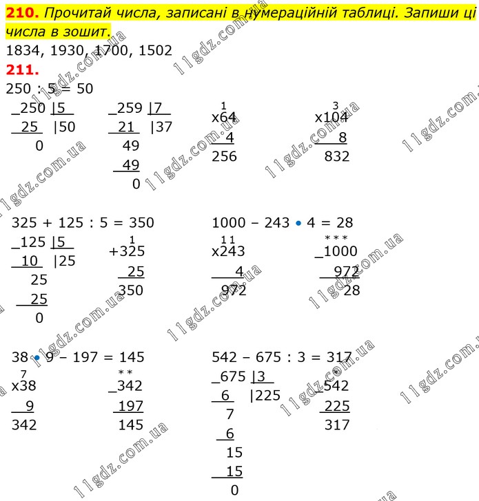 210. Прочитай числа, записані в нумераційній таблиці. Запиши ці числа в зошит. 1834, 1930, 1700, 1502