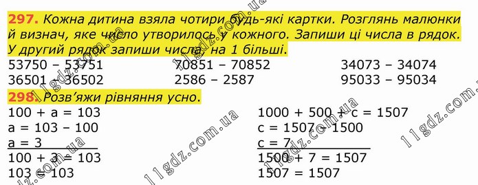 Кожна дитина взяла чотири будь-які картки. Розглянь малюнки й визнач, яке число утворилось у кожного. Запиши ці числа в рядок. У другий рядок запиши числа, на 1 більші. 53750 – 53751 36501 – 36502 70851 – 70852 2586 – 2587 34073 – 34074 95033 – 95034 298. Розв’яжи рівняння усно. 100 + а = 103 а = 103 – 100 а = 3_______ 100 + 3 = 103 103 = 103 1000 + 500 + с = 1507 с = 1507 – 1500 с = 7__________ 1500 + 7 = 1507 1507 = 1507