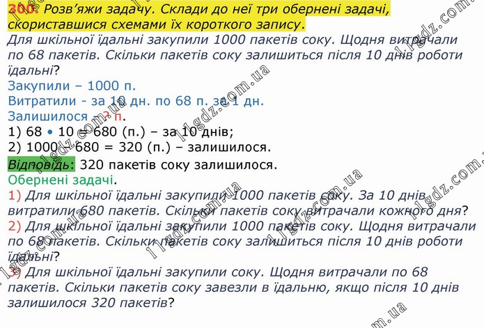 Розв’яжи задачу. Склади до неї три обернені задачі, скориставшися схемами їх короткого запису. Для шкільної їдальні закупили 1000 пакетів соку. Щодня витрачали по 68 пакетів. Скільки пакетів соку залишиться після 10 днів роботи їдальні? Закупили – 1000 п. Витратили - за 10 дн. по 68 п. за 1 дн. Залишилося - ? п. 1) 68 • 10 = 680 (п.) – за 10 днів; 2) 1000 – 680 = 320 (п.) – залишилося. Відповідь: 320 пакетів соку залишилося. Обернені задачі. 1) Для шкільної їдальні закупили 1000 пакетів соку. За 10 днів витратили 680 пакетів. Скільки пакетів соку витрачали кожного дня? 2) Для шкільної їдальні закупили 1000 пакетів соку. Щодня витрачали по 68 пакетів. Скільки пакетів соку залишиться після 10 днів роботи їдальні? 3) Для шкільної їдальні закупили соку. Щодня витрачали по 68 пакетів. Скільки пакетів соку завезли в їдальню, якщо після 10 днів залишилося 320 пакетів?