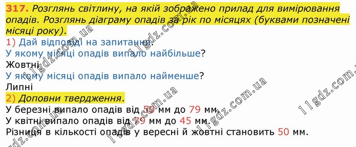 Розглянь світлину, на якій зображено прилад для вимірювання опадів. Розглянь діаграму опадів за рік по місяцях (буквами позначені місяці року). 1) Дай відповіді на запитання. У якому місяці опадів випало найбільше? Жовтні У якому місяці опадів випало найменше? Липні 2) Доповни твердження. У березні випало опадів від 50 мм до 79 мм. У квітні випало опадів від 79 мм до 45 мм. Різниця в кількості опадів у вересні й жовтні становить 50 мм.