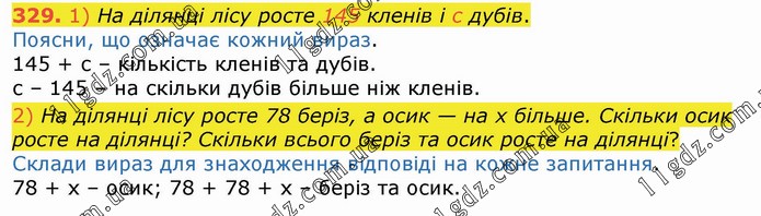 1) На ділянці лісу росте 145 кленів і с дубів. Поясни, що означає кожний вираз. 145 + с – кількість кленів та дубів. с – 145 – на скільки дубів більше ніж кленів. 2) На ділянці лісу росте 78 беріз, а осик — на х більше. Скільки осик росте на ділянці? Скільки всього беріз та осик росте на ділянці? Склади вираз для знаходження відповіді на кожне запитання. 78 + х – осик; 78 + 78 + х – беріз та осик.
