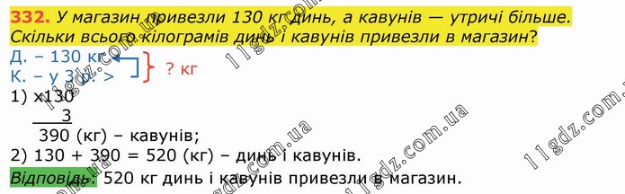 У магазин привезли 130 кг динь, а кавунів — утричі більше. Скільки всього кілограмів динь і кавунів привезли в магазин?