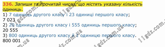 Запиши та прочитай числа, що містять указану кількість одиниць. 1) 7 одиниць другого класу і 23 одиниці першого класу; 7 023 2) 20 одиниць другого класу і 555 одиниць першого класу; 20 555 3) 800 одиниць другого класу й 1 одиницю першого класу. 800 001