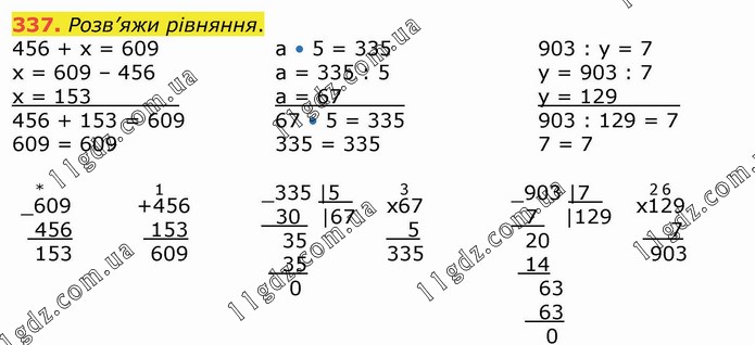 Розв’яжи рівняння. 456 + х = 609 х = 609 – 456 х = 153_______ 456 + 153 = 609 609 = 609 а • 5 = 335 а = 335 : 5 а = 67_____ 67 • 5 = 335 335 = 335 903 : y = 7 у = 903 : 7 у = 129_____ 903 : 129 = 7 7 = 7