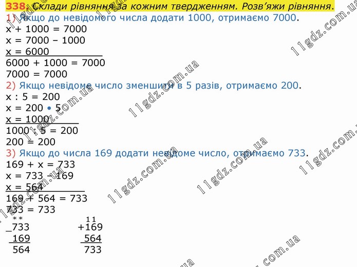 Склади рівняння за кожним твердженням. Розв’яжи рівняння. 1) Якщо до невідомого числа додати 1000, отримаємо 7000. х + 1000 = 7000 х = 7000 – 1000 х = 6000_________ 6000 + 1000 = 7000 7000 = 7000 2) Якщо невідоме число зменшити в 5 разів, отримаємо 200. х : 5 = 200 х = 200 • 5 х = 1000_____ 1000 : 5 = 200 200 = 200 3) Якщо до числа 169 додати невідоме число, отримаємо 733. 169 + х = 733 х = 733 – 169 х = 564_______ 169 + 564 = 733 733 = 733
