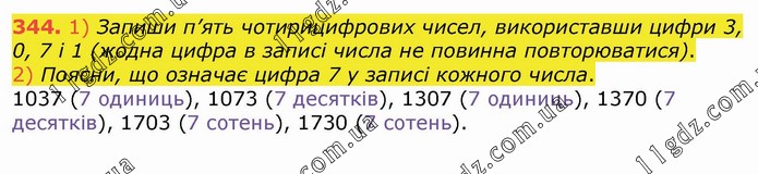 1) Запиши п’ять чотирицифрових чисел, використавши цифри 3, 0, 7 і 1 (жодна цифра в записі числа не повинна повторюватися). 2) Поясни, що означає цифра 7 у записі кожного числа. 1037 (7 одиниць), 1073 (7 десятків), 1307 (7 одиниць), 1370 (7 десятків), 1703 (7 сотень), 1730 (7 сотень).