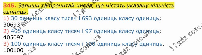 Запиши та прочитай числа, що містять указану кількість одиниць. 1) 30 одиниць класу тисяч і 693 одиниць класу одиниць; 30693 2) 405 одиниць класу тисяч і 97 одиниць класу одиниць; 405097 3) 100 одиниць класу тисяч і 100 одиниць класу одиниць. 100100
