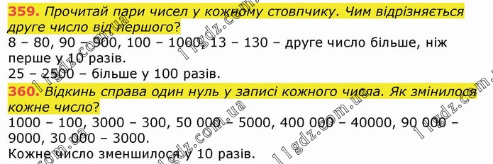 Прочитай пари чисел у кожному стовпчику. Чим відрізняється друге число від першого? 8 – 80, 90 – 900, 100 – 1000, 13 – 130 – друге число більше, ніж перше у 10 разів. 25 – 2500 – більше у 100 разів. 360. Відкинь справа один нуль у записі кожного числа. Як змінилося кожне число? 1000 – 100, 3000 – 300, 50 000 – 5000, 400 000 – 40000, 90 000 – 9000, 30 000 – 3000. Кожне число зменшилося у 10 разів.