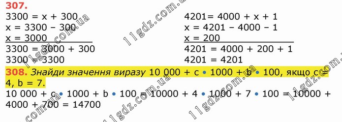 3300 = х + 300 х = 3300 – 300 х = 3000________ 3300 = 3000 + 300 3300 = 3300 4201= 4000 + х + 1 х = 4201 – 4000 – 1 х = 200_____________ 4201 = 4000 + 200 + 1 4201 = 4201 308. Знайди значення виразу 10 000 + с • 1000 + b • 100, якщо с = 4, b = 7. 10 000 + с • 1000 + b • 100 = 10000 + 4 • 1000 + 7 • 100 = 10000 + 4000 + 700 = 14700
