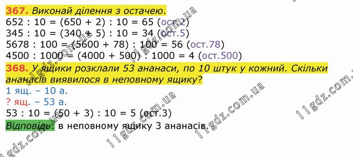 Виконай ділення з остачею. 652 : 10 = (650 + 2) : 10 = 65 (ост.2) 345 : 10 = (340 + 5) : 10 = 34 (ост.5) 5678 : 100 = (5600 + 78) : 100 = 56 (ост.78) 4500 : 1000 = (4000 + 500) : 1000 = 4 (ост.500) 368. У ящики розклали 53 ананаси, по 10 штук у кожний. Скільки ананасів виявилося в неповному ящику? 1 ящ. – 10 а. ? ящ. – 53 а. 53 : 10 = (50 + 3) : 10 = 5 (ост.3) Відповідь: в неповному ящику 3 ананасів.