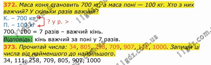 Маса коня становить 700 кг, а маса поні — 100 кг. Хто з них важчий? У скільки разів важчий? К. – 700 кг П. – 100 кг 700 : 100 = 7 разів – важчий кінь. Відповідь: кінь важчий за поні у 7 разів. 373. Прочитай числа: 34, 805, 258, 709, 907, 111, 1000. Запиши ці числа від найменшого до найбільшого. 34, 111, 258, 709, 805, 907, 1000