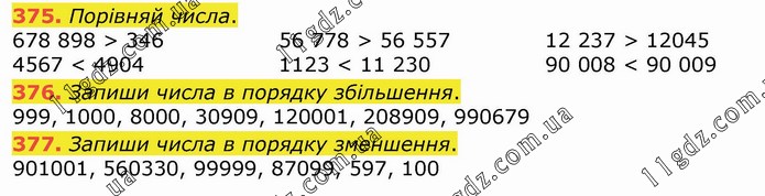 Порівняй числа. 678 898 > 346 4567 < 4904 56 778 > 56 557 1123 < 11 230 12 237 > 12045 90 008 < 90 009 376. Запиши числа в порядку збільшення. 999, 1000, 8000, 30909, 120001, 208909, 990679 377. Запиши числа в порядку зменшення. 901001, 560330, 99999, 87099, 597, 100