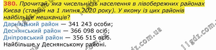 Прочитай, яка чисельність населення в лівобережних районах Києва (станом на 1 липня 2020 року). У якому із цих районів найбільше мешканців? Дарницький район — 341 243 особи; Деснянський район — 366 098 осіб; Дніпровський район — 356 515 осіб. Найбільше у Деснянському районі.