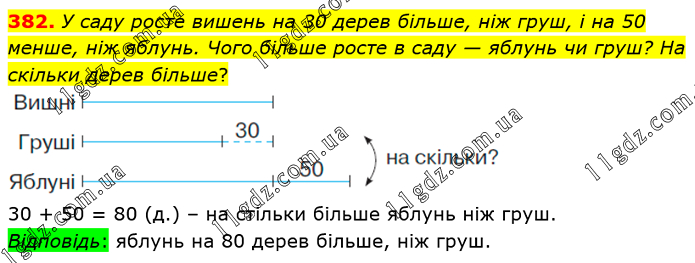 У саду росте вишень на 30 дерев більше, ніж груш, і на 50 менше, ніж яблунь. Чого більше росте в саду — яблунь чи груш? На скільки дерев більше? 30 + 50 = 80 (д.) – на стільки більше яблунь ніж груш. Відповідь: яблунь на 80 дерев більше, ніж груш.