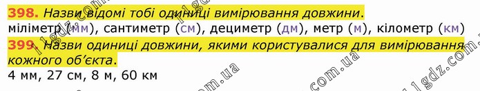 Назви відомі тобі одиниці вимірювання довжини. міліметр (мм), сантиметр (см), дециметр (дм), метр (м), кілометр (км) 399. Назви одиниці довжини, якими користувалися для вимірювання кожного об’єкта. 4 мм, 27 см, 8 м, 60 км