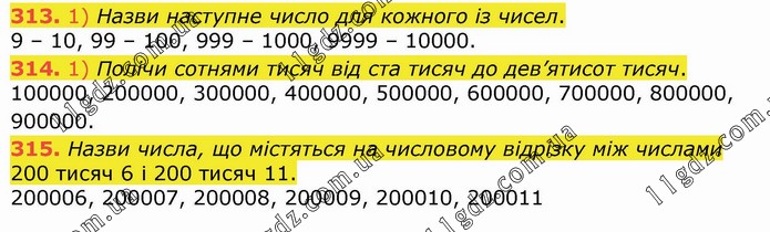 1) Назви наступне число для кожного із чисел. 9 – 10, 99 – 100, 999 – 1000, 9999 – 10000. 314. 1) Полічи сотнями тисяч від ста тисяч до дев’ятисот тисяч. 100000, 200000, 300000, 400000, 500000, 600000, 700000, 800000, 900000. 315. Назви числа, що містяться на числовому відрізку між числами 200 тисяч 6 і 200 тисяч 11. 200006, 200007, 200008, 200009, 200010, 200011