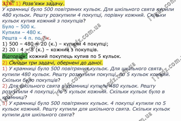 1) Розв’яжи задачу. У крамниці було 500 повітряних кульок. Для шкільного свята купили 480 кульок. Решту розкупили 4 покупці, порівну кожний. Скільки кульок купив кожний з покупців? Було – 500 к. Купили – 480 к. Решта – 4 п. по ? к. 1) 500 – 480 = 20 (к.) – купили 4 покупці; 2) 20 : 4 = 5 (к.) – кожний з покупців. Відповідь: кожний покупець купив по 5 кульок. 2) Склади три задачі, обернені до даної. 1) У крамниці було 500 повітряних кульок. Для шкільного свята купили 480 кульок. Решту розкупили покупці, по 5 кульок кожний. Скільки було покупців? 2) Для шкільного свята в крамниці купили 480 кульок. Решту розкупили 4 покупці, по 5 кульок кожний. Скільки кульок було в крамниці? 3) У крамниці було 500 повітряних кульок. 4 покупці купили по 5 кульок кожний. Решту купили для шкільного свята. Скільки кульок купили для шкільного свята?